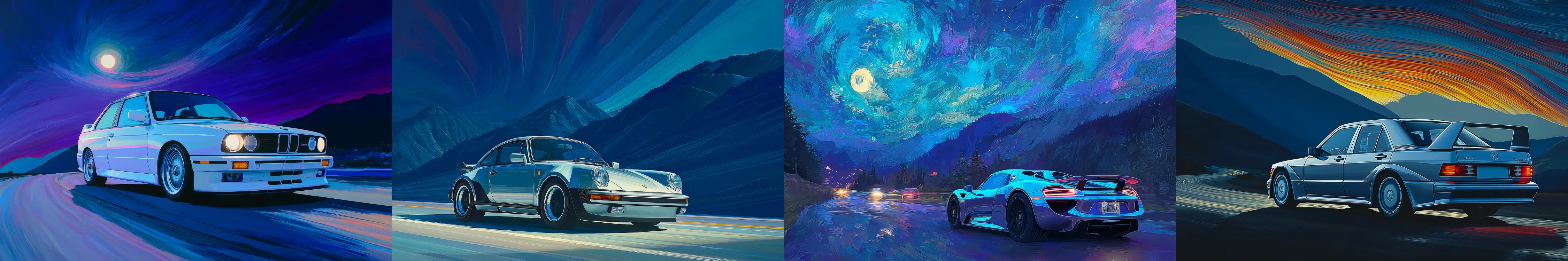 German automotive legends redefined through dual-state art — measured stillness by day, radiant control by night. A collection of frames where efficiency and light create harmony.