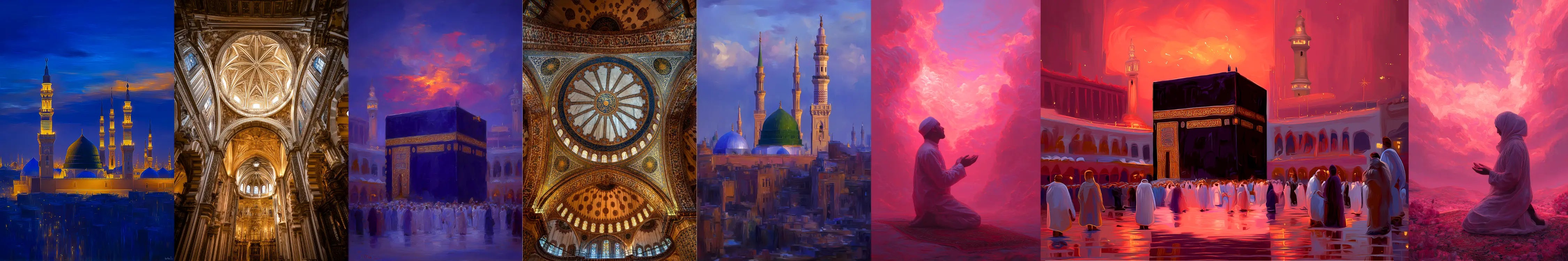 Islamic wall art glowing in sacred light — mosques, crescents, and calligraphy serene by day, radiant by night. Perfect for Islamic home decor and believers.