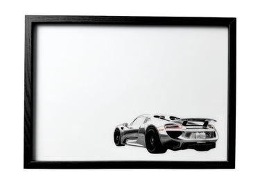 A rear three-quarter view of the 2013 Porsche 918 Spyder stands in metallic silver detailed with black spoiler. By night, moonlit skies twist above the horizon — where German innovation meets the poetry of motion.