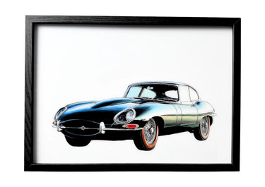 Racing green Jaguar E-Type 1961 wall art resting in still reflection. A framed tribute to British automotive elegance.