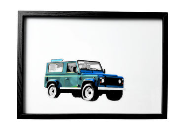 Land Rover Defender 1994 wall art in teal and pine-green tones beside a rugged coastline. A framed tribute to timeless British design.