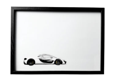 A 2013 McLaren P1 side profile captured in sleek stillness — by night, waves of cobalt and teal unfurl behind its lightening yellow body, a British supercar heritage.
