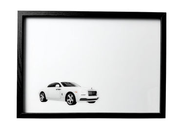 A 2013 Rolls-Royce Wraith rests in quiet clarity — by night, violet skies unfold above it, scattering celestial light across its white form.