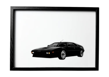 BMW M1 wall art front three-quarter view in black with amber lights. A framed celebration of German automotive precision.