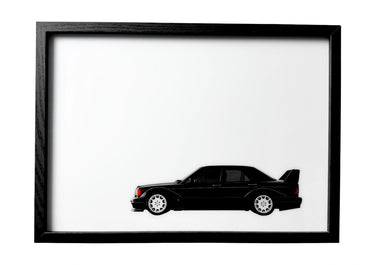 Mercedes-Benz 190E Evolution II wall art in black finish with rear spoiler and amber brake lights. A framed celebration of German performance design.