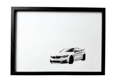 A front three-quarter view of the 2014 BMW M4 stands in monochrome detailed with black grille. By night, turquoise skies twist above the coast and the body ignites in burnt orange.