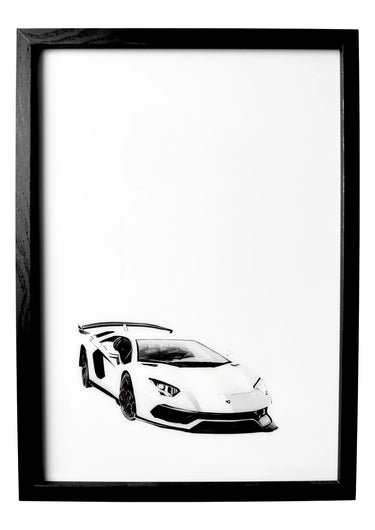 2019 Lamborghini Aventador SVJ wall art in sleek white finish, front three-quarter view.