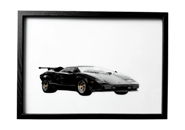 A 1986 Lamborghini Countach rests in polished black with gold rims — by dusk, its surface mirrors a coral Italian sky, the Amalfi coastline igniting in warmth and motion.