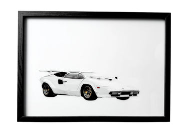 1986 Lamborghini Countach 5000 QV wall art in white with gold rims, front three-quarter view.