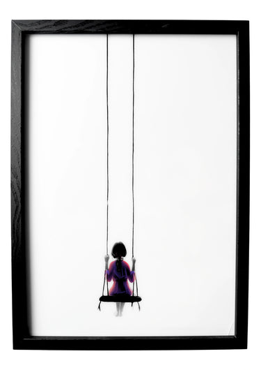 A girl wearing a soft lilac dress & bow drifts on her swing, serene beneath a deep midnight sky. Clouds shimmer in violet and gold — a dreamscape creating a nursery filled with enchantment.