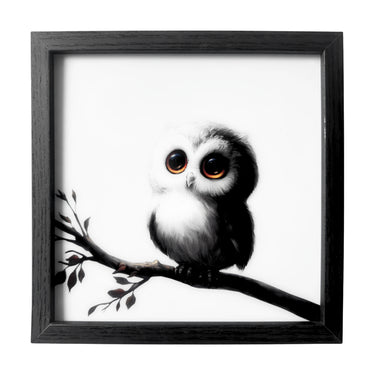 Minimalist baby owl wall art with warm brown eyes sitting on a branch. A framed gentle nursery companion.